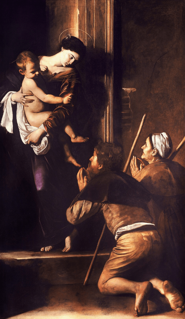 In this particular work, the light falls most decisively on the face of the Madonna holding her Child, the Christ, highlighting her as the main figure as she bestows the presence of her son, Jesus, on those who come to them, humbly seeking the divine. The light also falls notably on the face of the female pilgrim, as well as the grubby bare feet of the male pilgrim. They both kneel, beseechingly, at their feet, while Christ imparts a blessing.